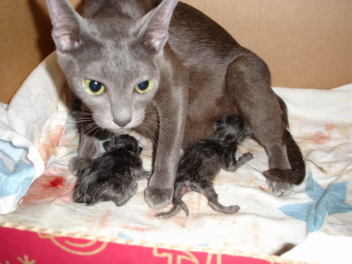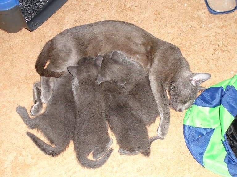 Inatt blev Maja orolig, och började bära upp ungarna till sängen. Hon ville lägga dem under täcket, där hon och Hanoo normalt sover (mellan matte och husse :-). Vi vände sängen så att vi kunde ha ögonkontakt med Maja i lådan, och hon accepterade att stanna där. Hon har ätit och druckit bra, och verkar ha tagit den snabba förlossningen väldigt bra. Hon vill gärna ha sällskap vid boet, och helst ska matte eller husse sitta där och klappa mamma och bebisar jämt (ingen är förvånad, hon är en "plåsterkatt")